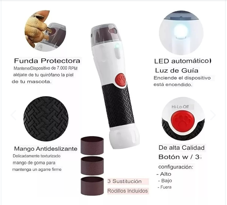 PawPerfectMaquina limadora de uñas para perros de uso doméstico y profesional para el cuidado de tu mascota. Cabeza giratoria ultra potente cubierta por una funda protectora para garantizar la seguridad de usted y de sus mascotas. La ranura para uñas mantiene las uñas dentro, pero la piel fuera. La luz LED incorporada se enciende automáticamente cuando se enciende el dispositivo. Hace que el aseo sea mucho más fácil y más seguro. Desactivado, todo con la pulsación de nuestro botón rojo en forma de patas de alta calidad.. Sin dolor, Limpia suavemente las uñas largas y afiladas.. 2 lijas de repuesto.. Alimentación: 3 Baterías AA (no incluidas).Contenido de la compra:1 x limador de uñas para perros.3 x limas redondas.